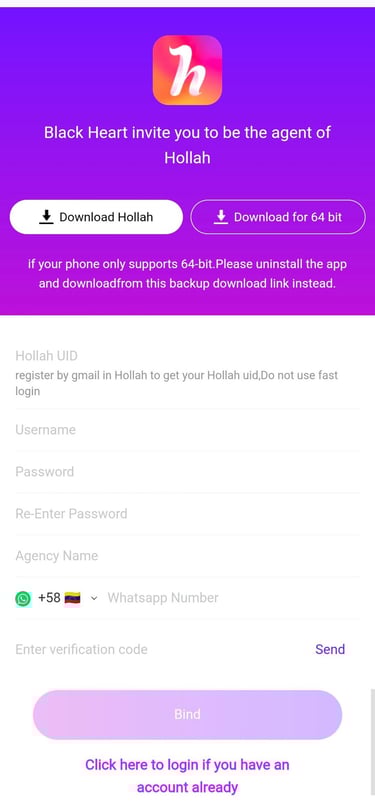 Hollah UID: Enter the UID you obtained from registering via Gmail within the Hollah app.